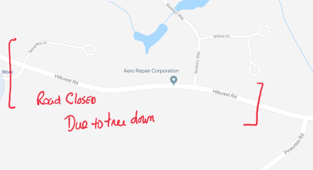 Due to tree down, Hillcrest Road is closed between Bear Run Drive and Pinecrest Road. No ETA.