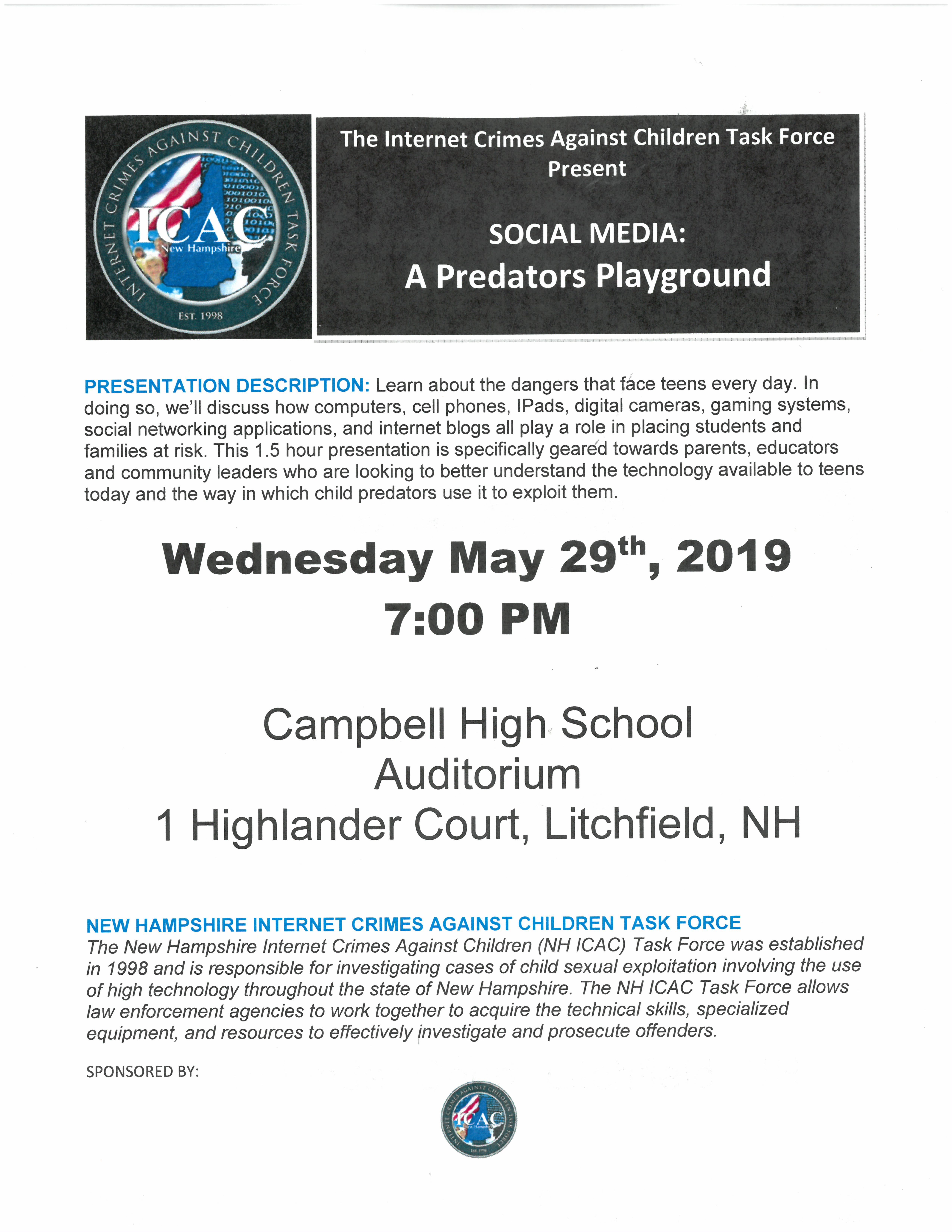 The frequency of these types of incidents has increased to multiple investigations per month. In order to better educate adults on how to protect our children from online predators, the Litchfield Police will be hosting a presentation on internet safety and the dangers that social media pose to children.